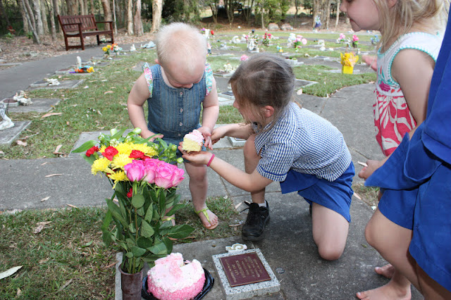 I picked the girls up from school at 3pm and then we met Michael at Lily's grave. The girls are always excited to come and see her. I give them the responsibility of brushing off any leaves or cut grass from her grave and then filling the vase with water to put the flowers in.